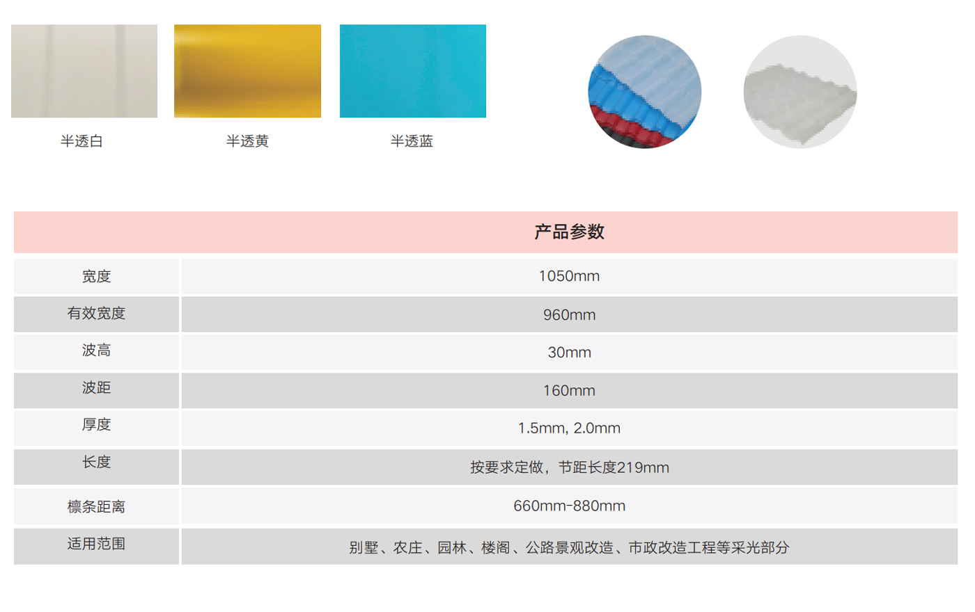 采光琉璃瓦是以聚氯乙烯树脂为主要原料,辅以UV抗紫外线剂,采用独特工艺制作而成,板面光洁透明、采光均匀柔和、防火阻燃、耐酸、碱和有机溶剂适用于各类现代工业厂房、商贸市场、温室大棚的采光应用。