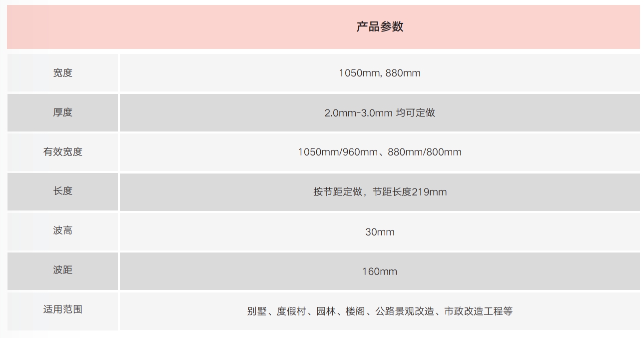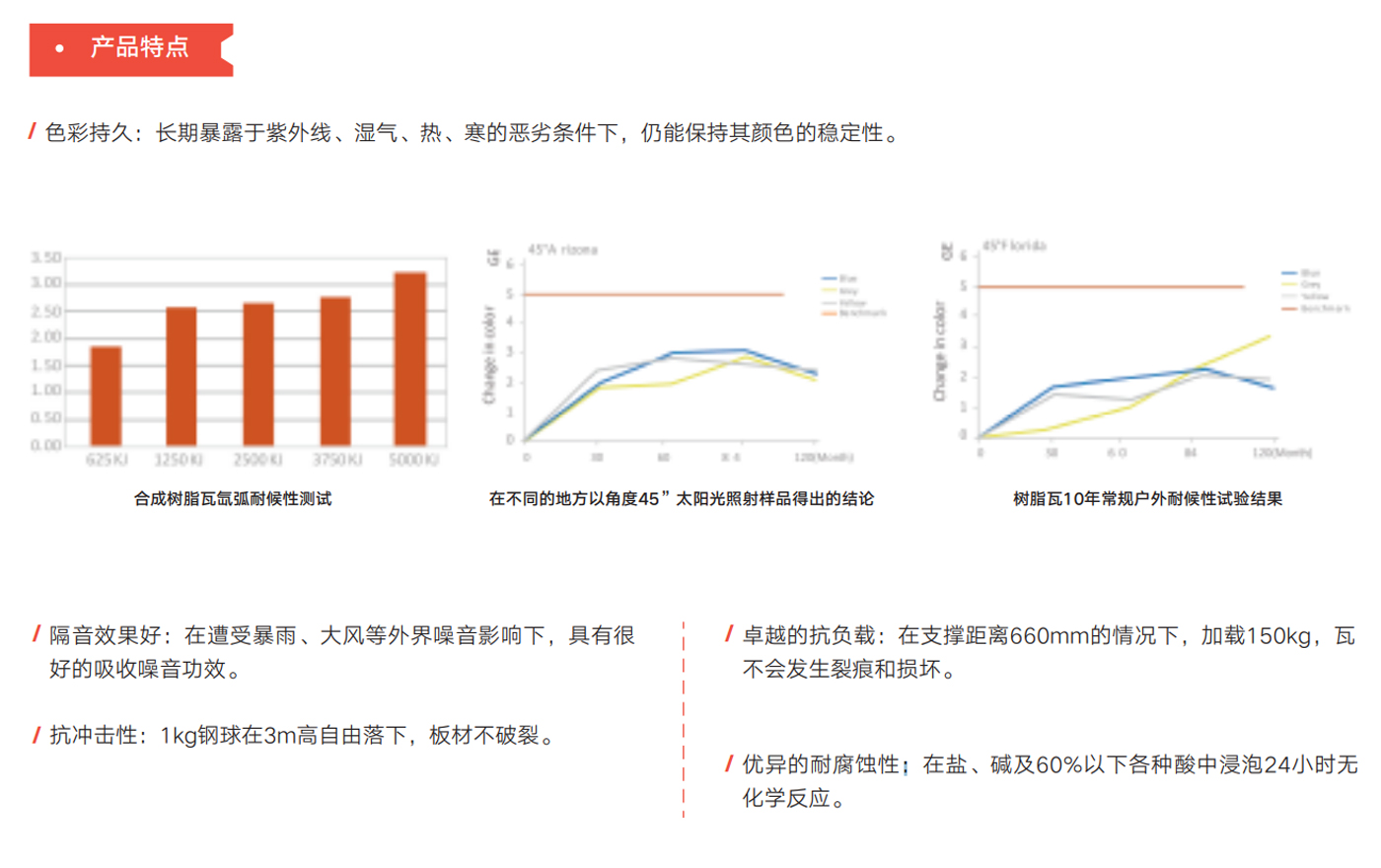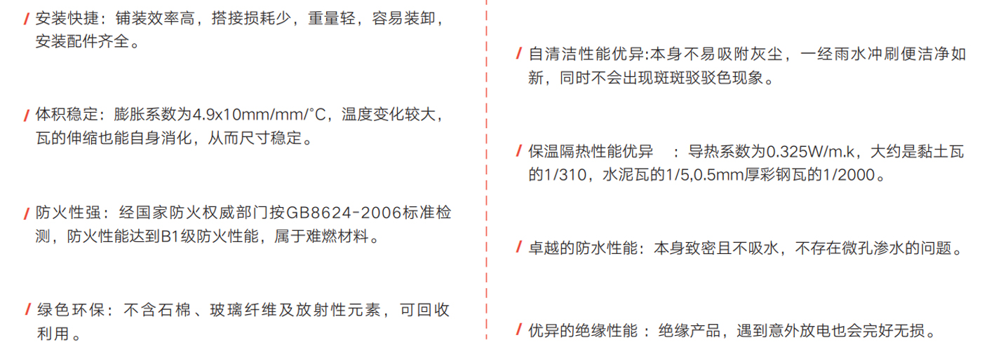 它具有色彩丰富并经久不褪,造型美观立体感强且符合中国建筑文化特色等突出的特点。同时还具有质轻、防水、坚韧、保温隔热、隔音、抗腐蚀、抗风防震、抗冰雹、抗污、绿色环保、防火、绝缘、安装简便等优点,是各类永久建筑屋面装饰和防水的理想材料,为高档屋面材料提供了一种更方便快捷的替代产品,尤其适用于我国目前乡村美化工程和城镇改造。